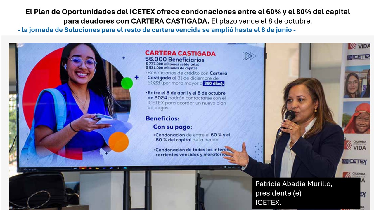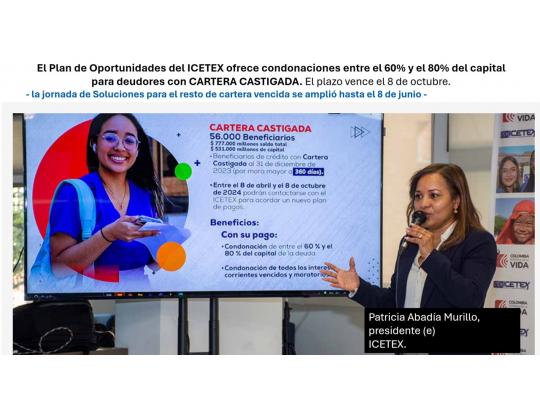 “Llega el momento de implementar oportunidades históricas que responden a las necesidades de miles de colombianos que representan las mayores dificultades para estar al día con su crédito educativo. Ofrecemos una oportunidad sin precedentes, y por única vez, para 56.000 colombianos que tenían su crédito con cartera castigada al 31 de diciembre. Podrán hacer un acuerdo de pago y, al cumplirlo, se les condonará entre el 60% y 80% del capital adeudado, incluidos los intereses moratorios”, manifestó Patricia Abadía Murillo, presidente (e) del ICETEX.