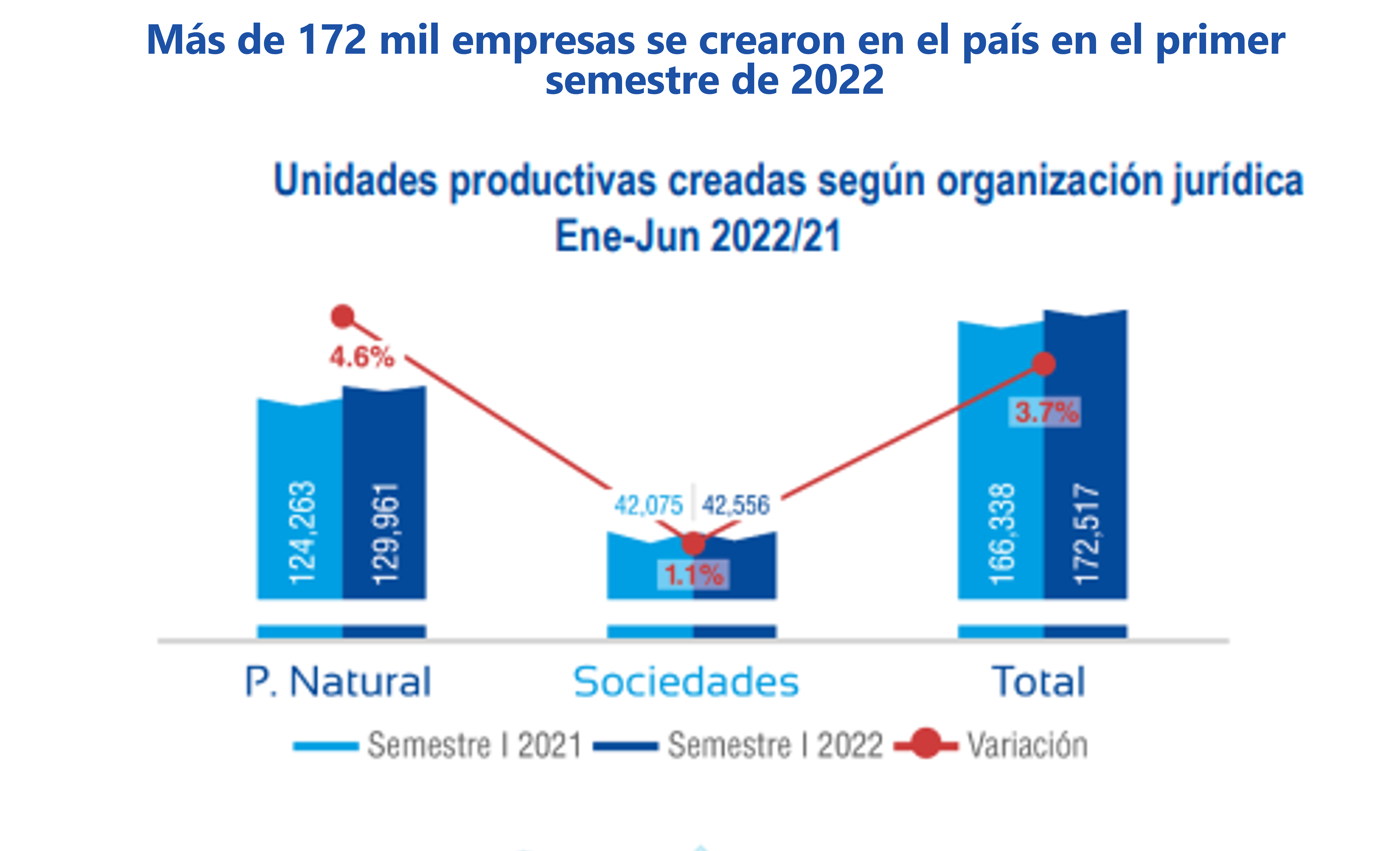 Entre enero y junio de 2022 se crearon 172.517 unidades productivas, 3,7% más que en el mismo periodo de 2021, cuando se ubicaba en 166.338 empresas. Del total de unidades registradas, 75,3% corresponden a personas naturales y 24,7% a sociedades.